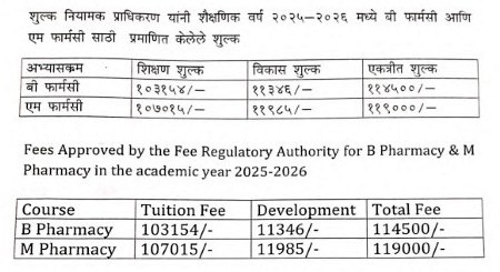 This fee is subject to final revision of fee from Shikshan Shulka Samiti, Mumbai. As per Information Brochure regarding fees prescribed in Un-Aided Pharmacy colleges, student will have to pay the fee for the current academic year, as decided by the Shikshan Shulka Samiti, Mumbai for this institute.