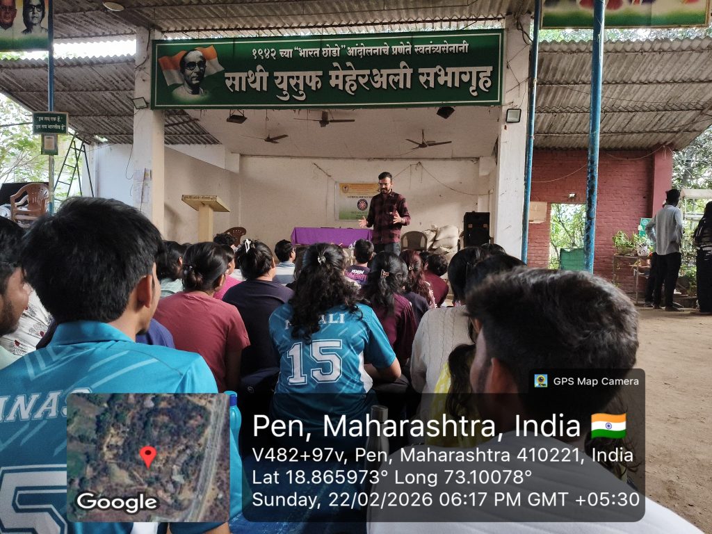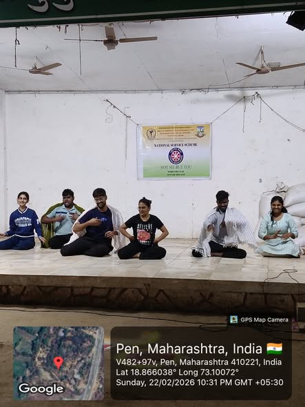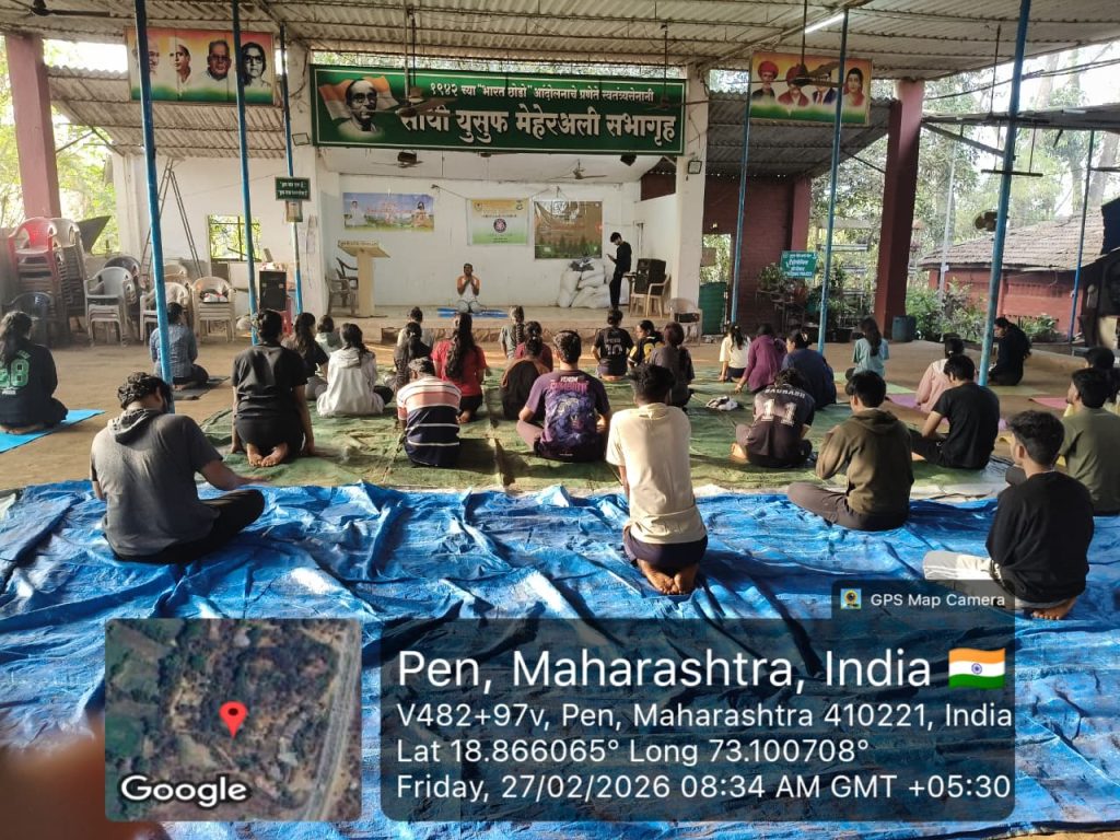 On **22nd February 2026**, a total of **47 NSS volunteers** reached the camp venue and actively participated in the camp activities with great enthusiasm. The camp was formally inaugurated in the presence of distinguished guests **Dr. Devidas Patil (Social Worker), Mr. Balkrishna Savant (PRO, Yusuf Meherally Centre), Dr. Dhruv Mehta (Physiotherapist), Mr. Harish Waghe (Treasurer, Yusuf Meherally Centre), and Mr. Mukul Ghadge (Ex-NSS Leader and Business Manager).**